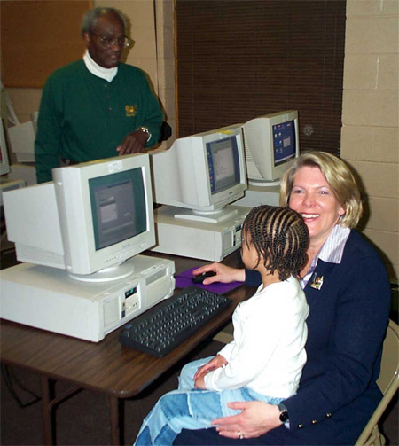 Jane Campbell with volunteer Ken Eskridge of Computers Assisting People at a new community computer lab on Kinsman Her baby was due May 15. Jane took to wearing oversized clothes to the point where a fellow legislator suggested she stop eating so much at all of the receptions.